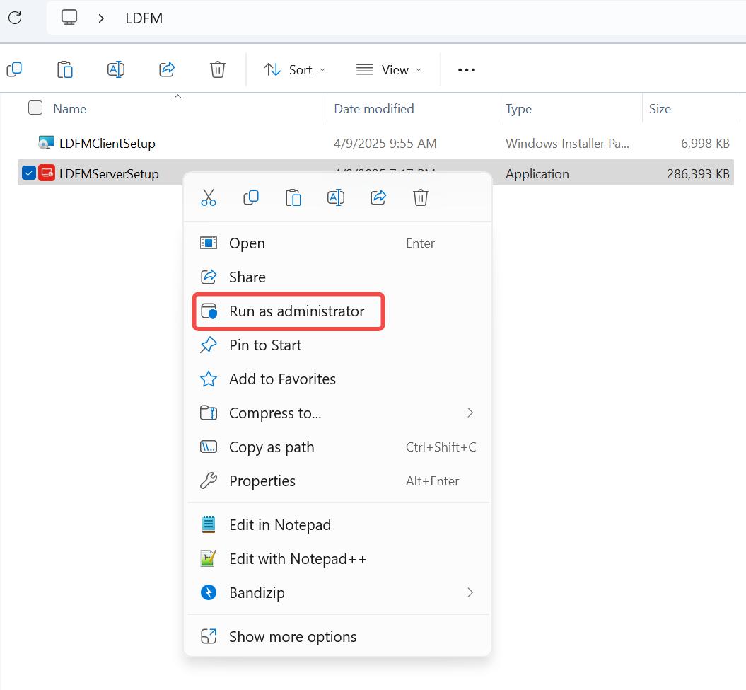 Right-click and run LDFMServerSetup as an administrator. On the User Account Control page, select "yes" to proceed to the next step.