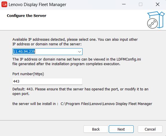 On the server configuration interface, you can either select or manually enter an IP address or domain name. The default port number is 443, and Copyright © Lenovo 10 Lenovo Display Fleet Manager Installation Guide it can be modified as needed. After confirming that the settings are correct, click "Next".