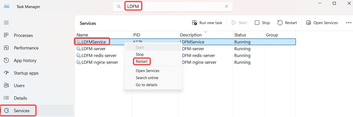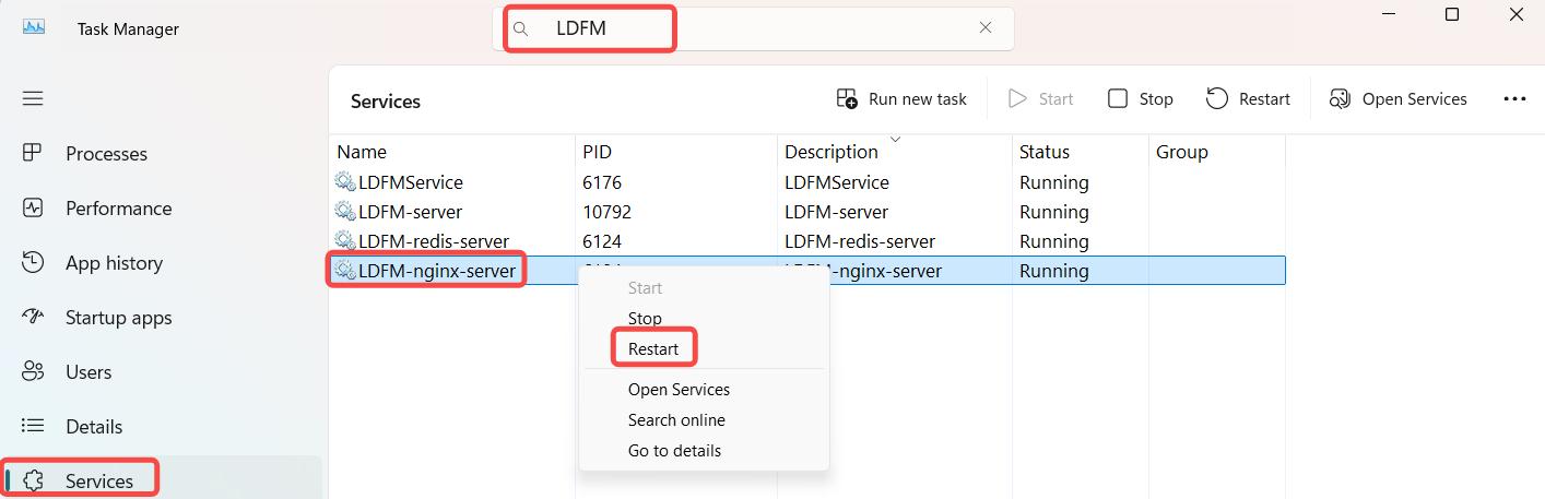 The front - end service of LDFMServer depends on nginx. By default, nginx uses port 80. If there is software running on port 80 on the current server, you need to modify the port configuration of nginx and then restart the LDFM service. The following is the method to modify the nginx port configuration.
