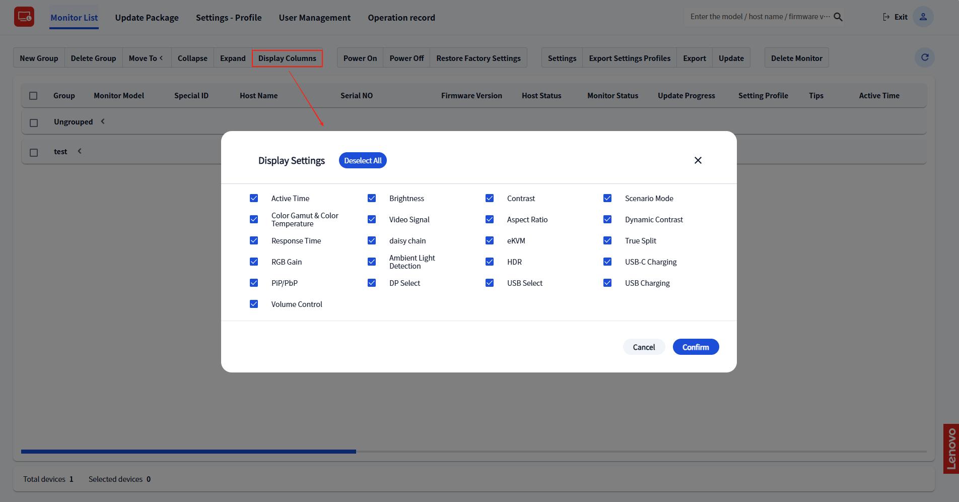 The Monitor list shows all OSD settings in columns by default. To customize the view: